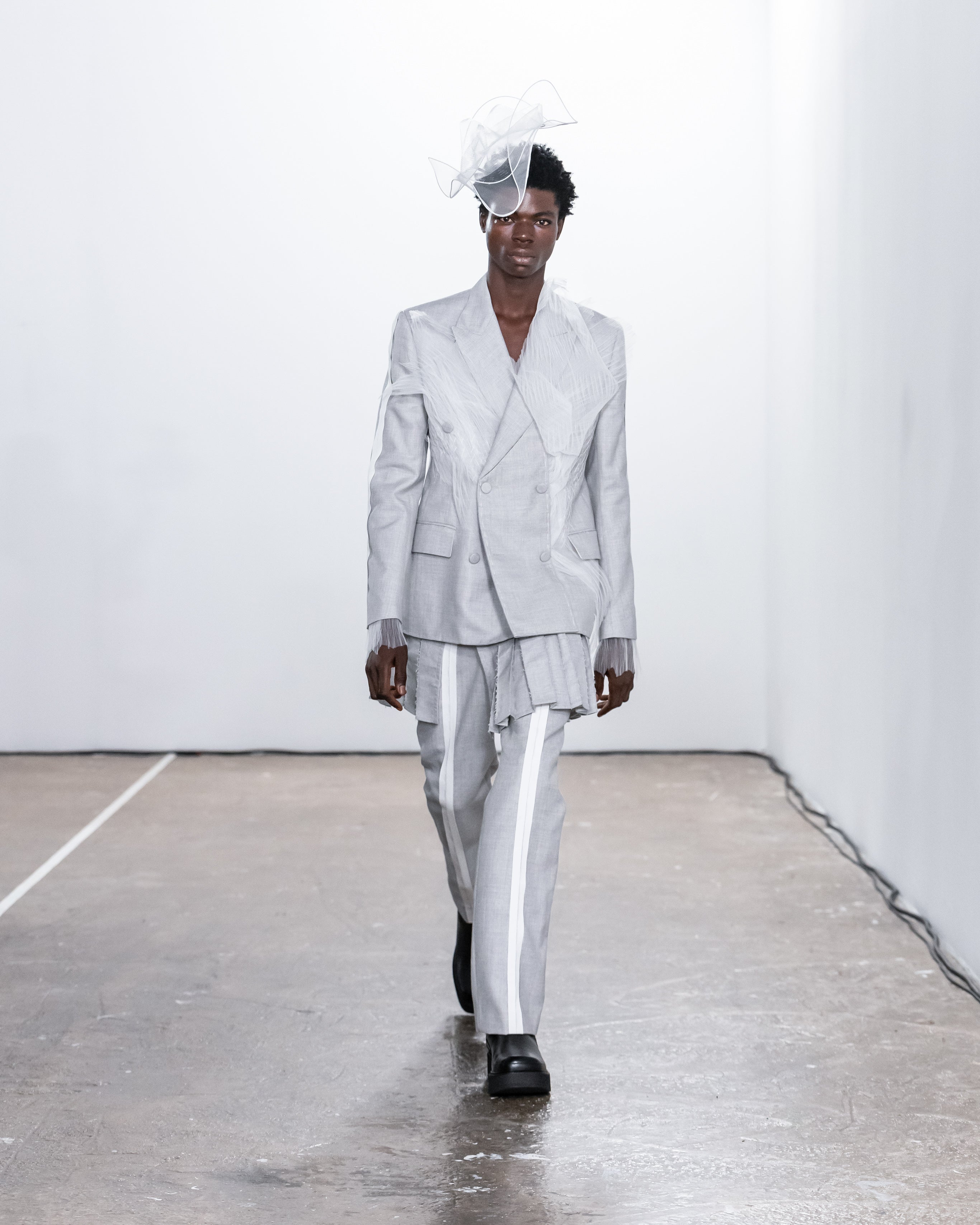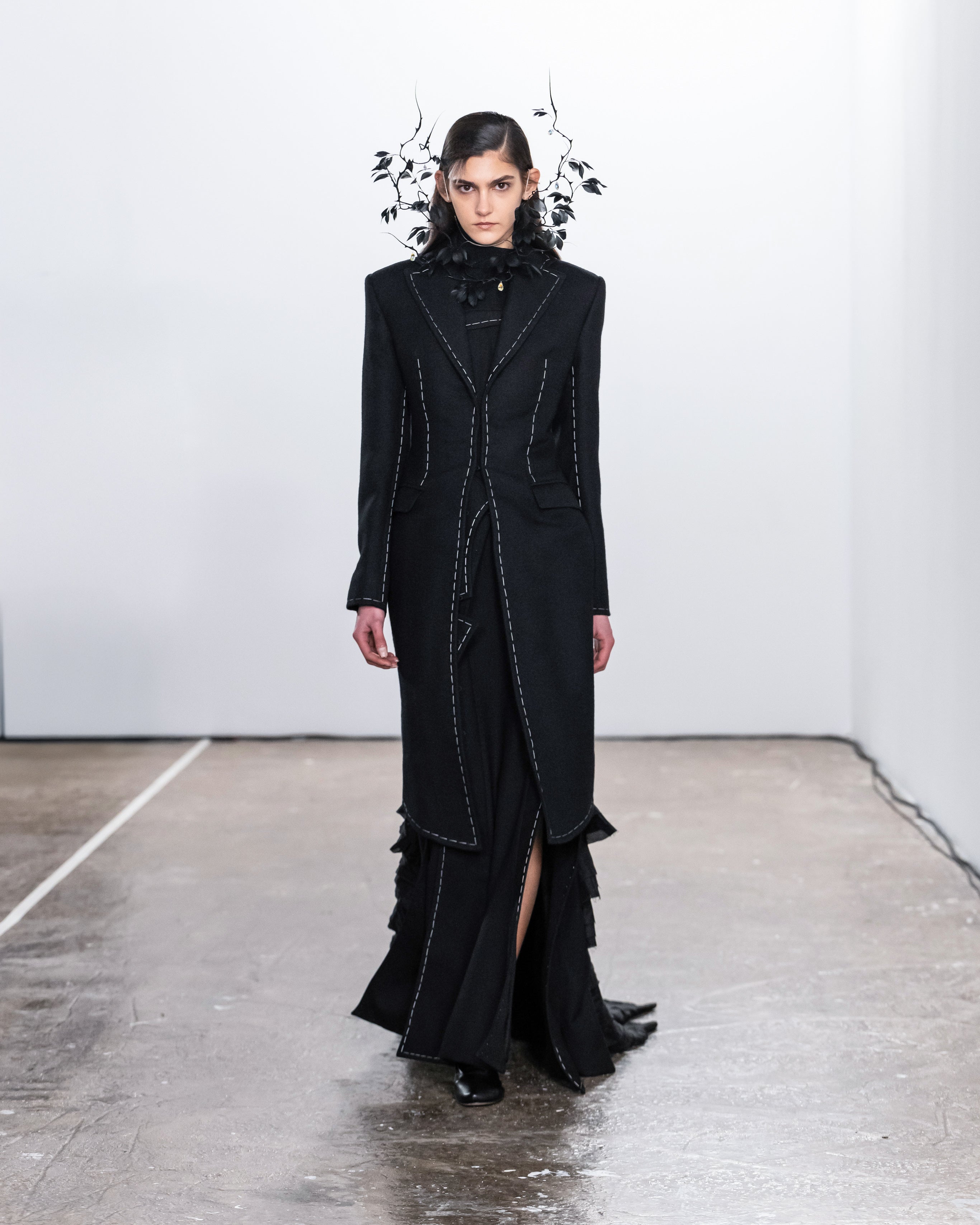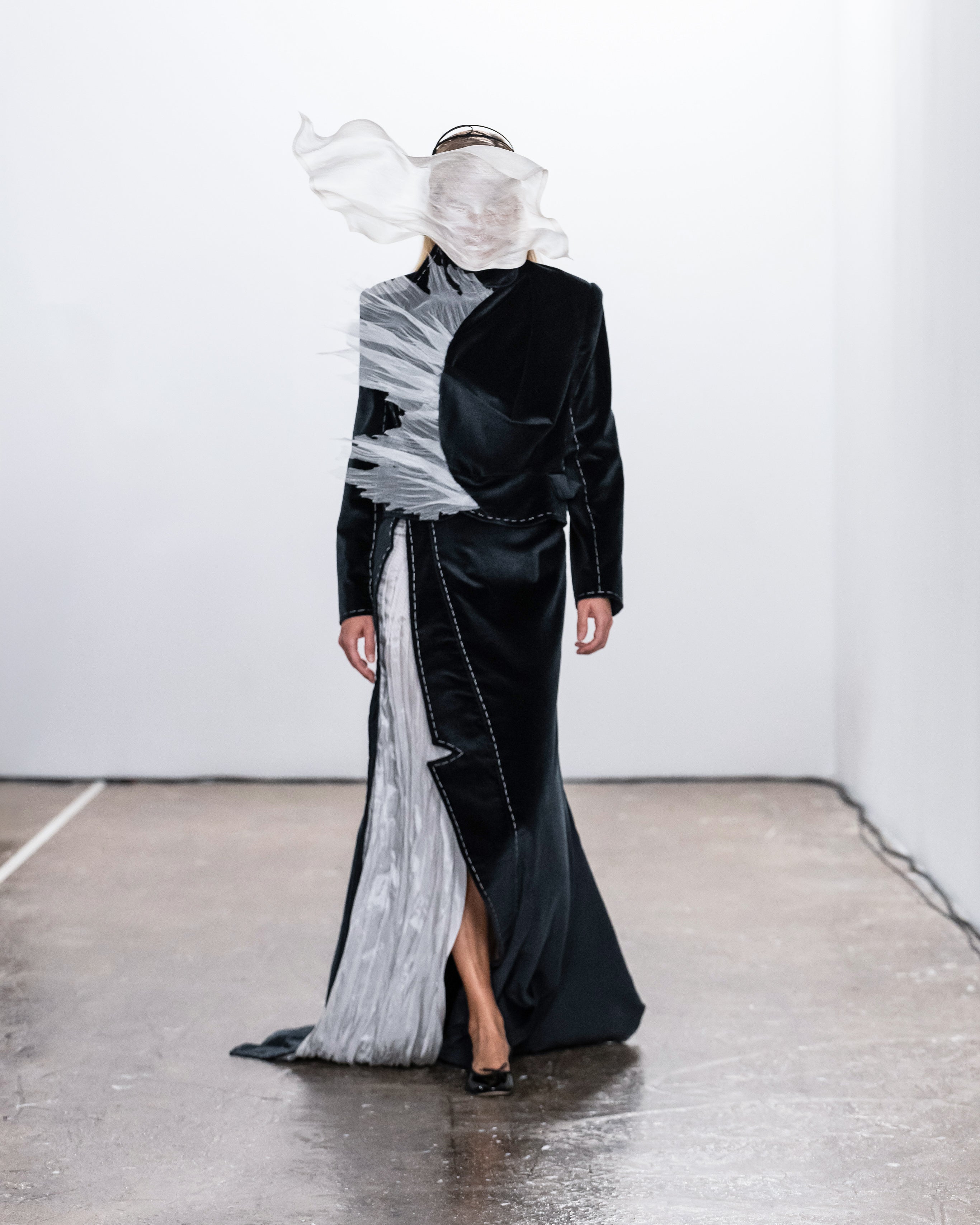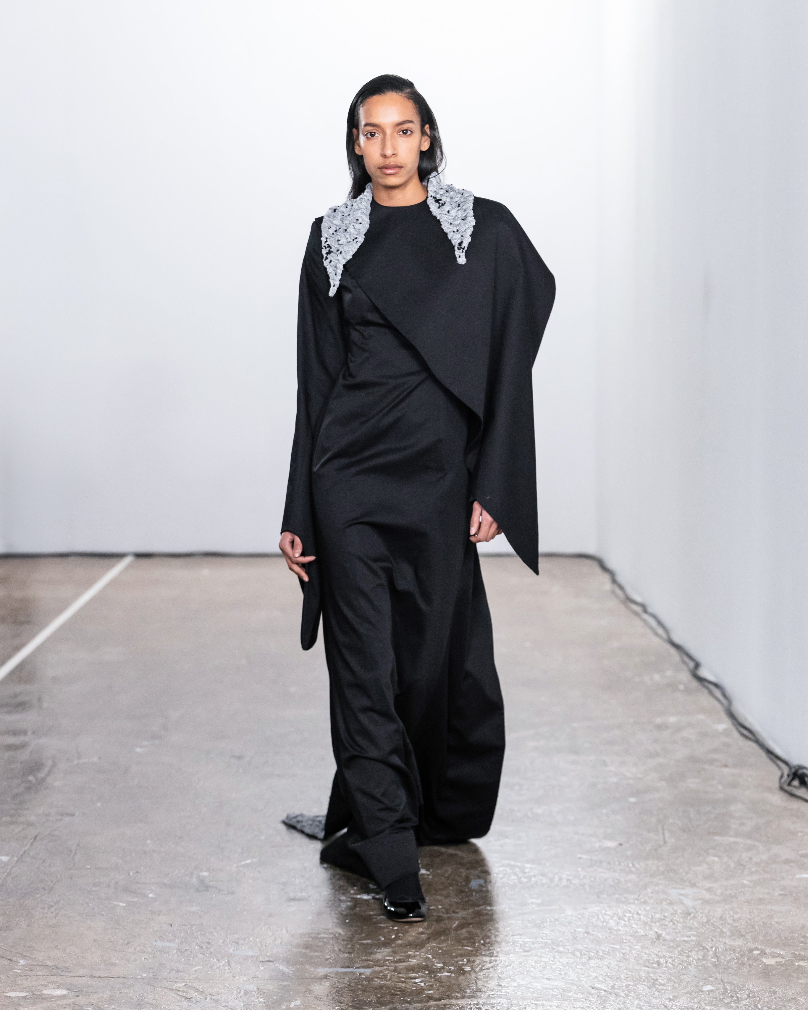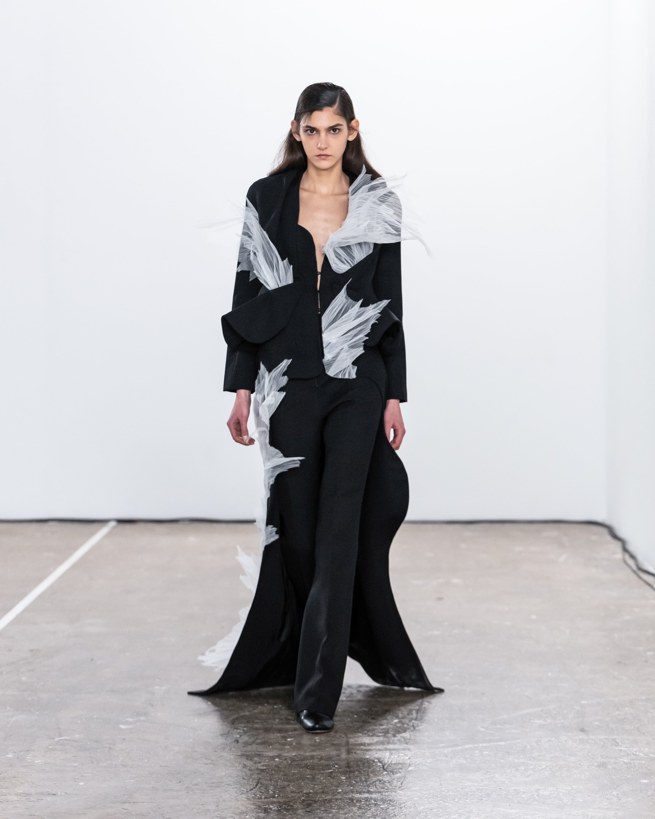Les créations incarnent ce récit à travers une fusion de lignes nettes et structurées et de formes douces et fluides, représentant nos dualités intérieures. Le drapé romantique rencontre la résistance des coupes, tandis que les textures superposées et les coupes asymétriques symbolisent la complexité de l'identité. Plis complexes, détails cachés et imperfections délibérées soulignent la beauté de l'impermanence et de l'évolution.