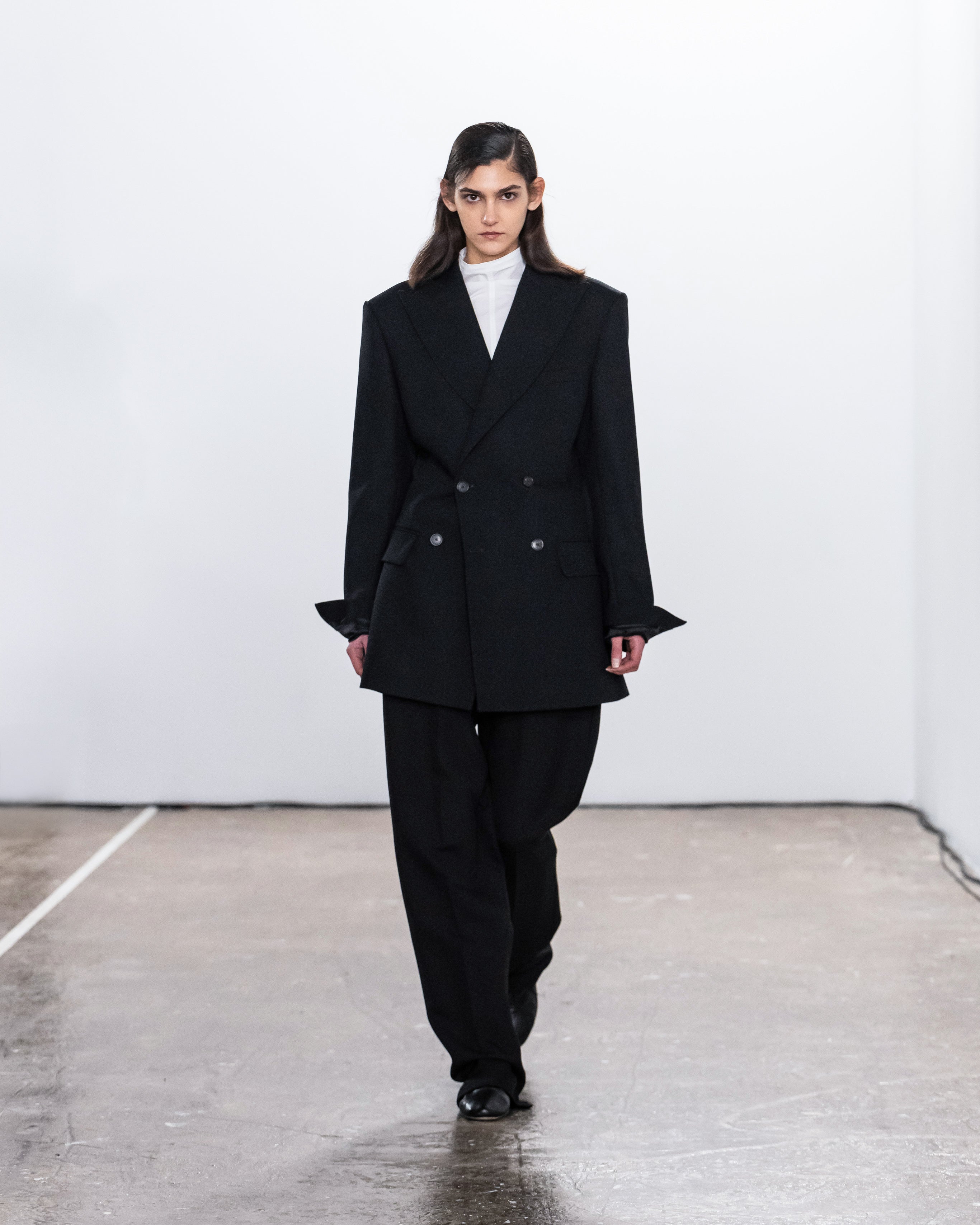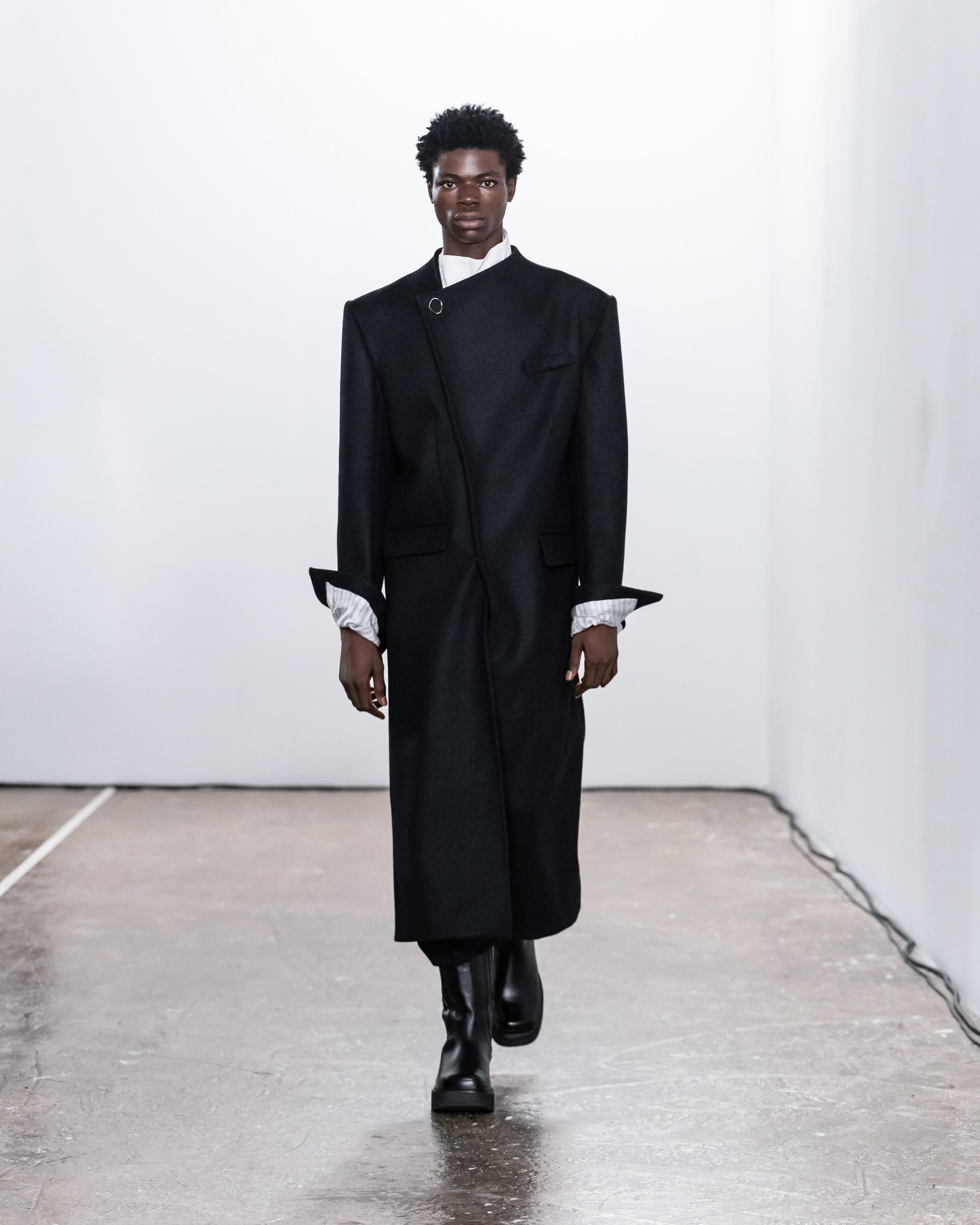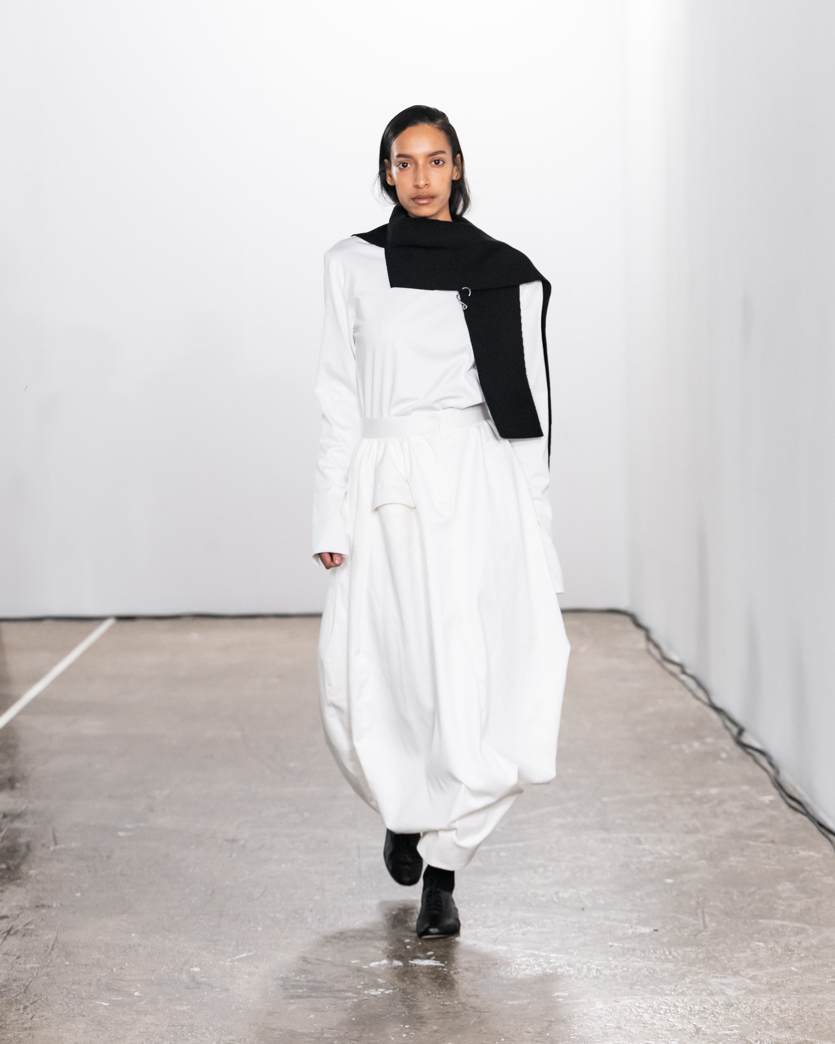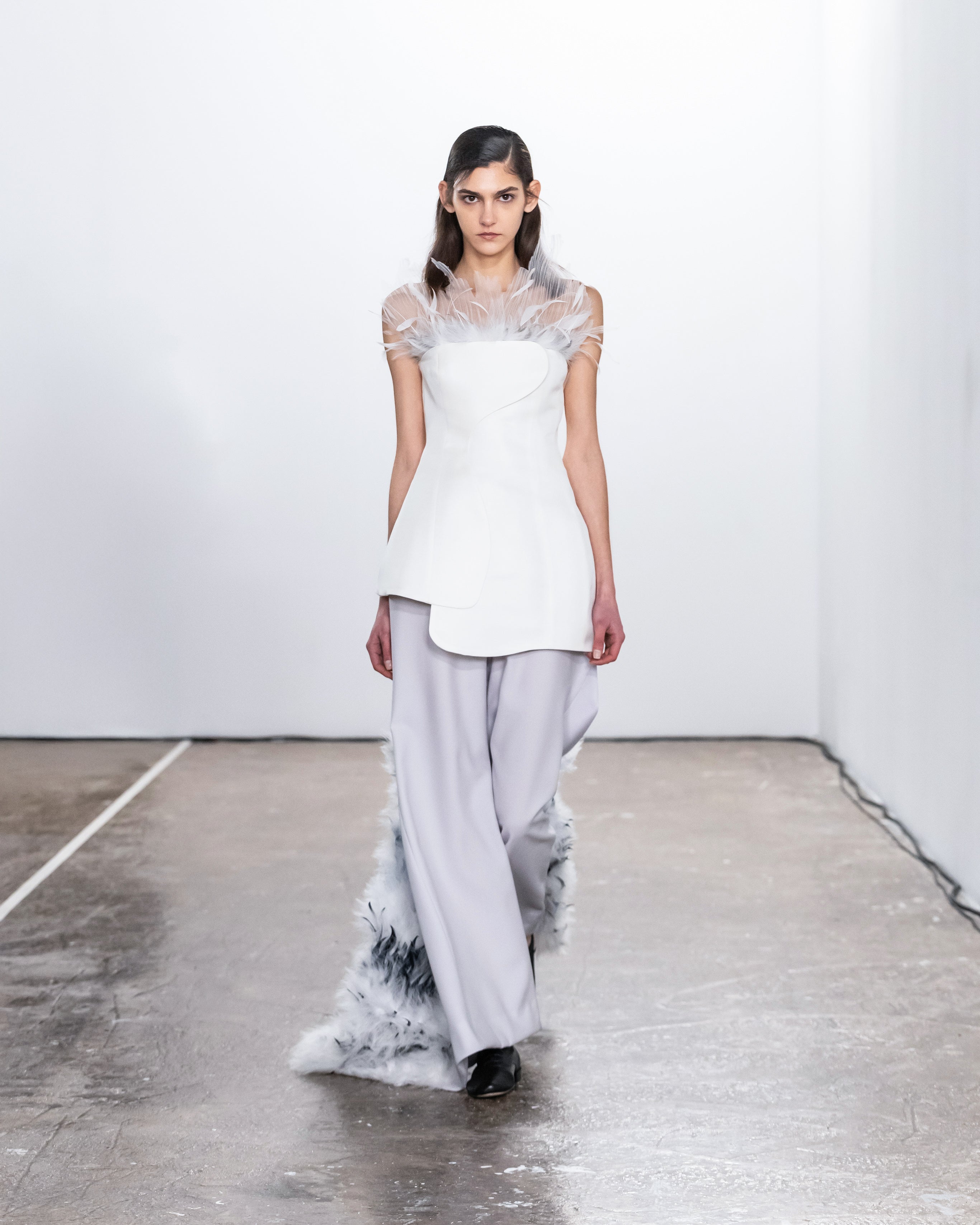 Les créations incarnent ce récit à travers une fusion de lignes nettes et structurées et de formes douces et fluides, représentant nos dualités intérieures. Le drapé romantique rencontre la résistance des coupes, tandis que les textures superposées et les coupes asymétriques symbolisent la complexité de l'identité. Plis complexes, détails cachés et imperfections délibérées soulignent la beauté de l'impermanence et de l'évolution.