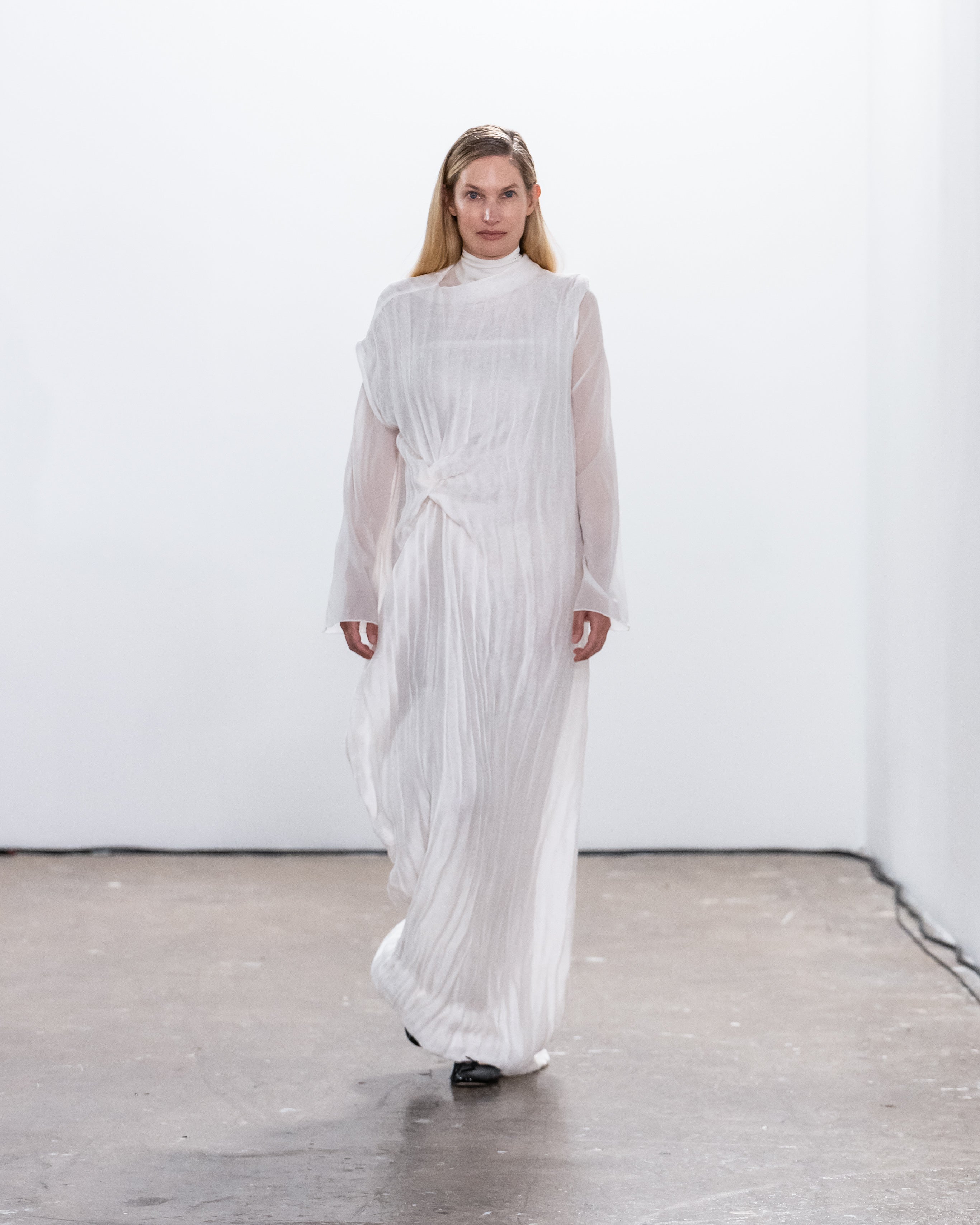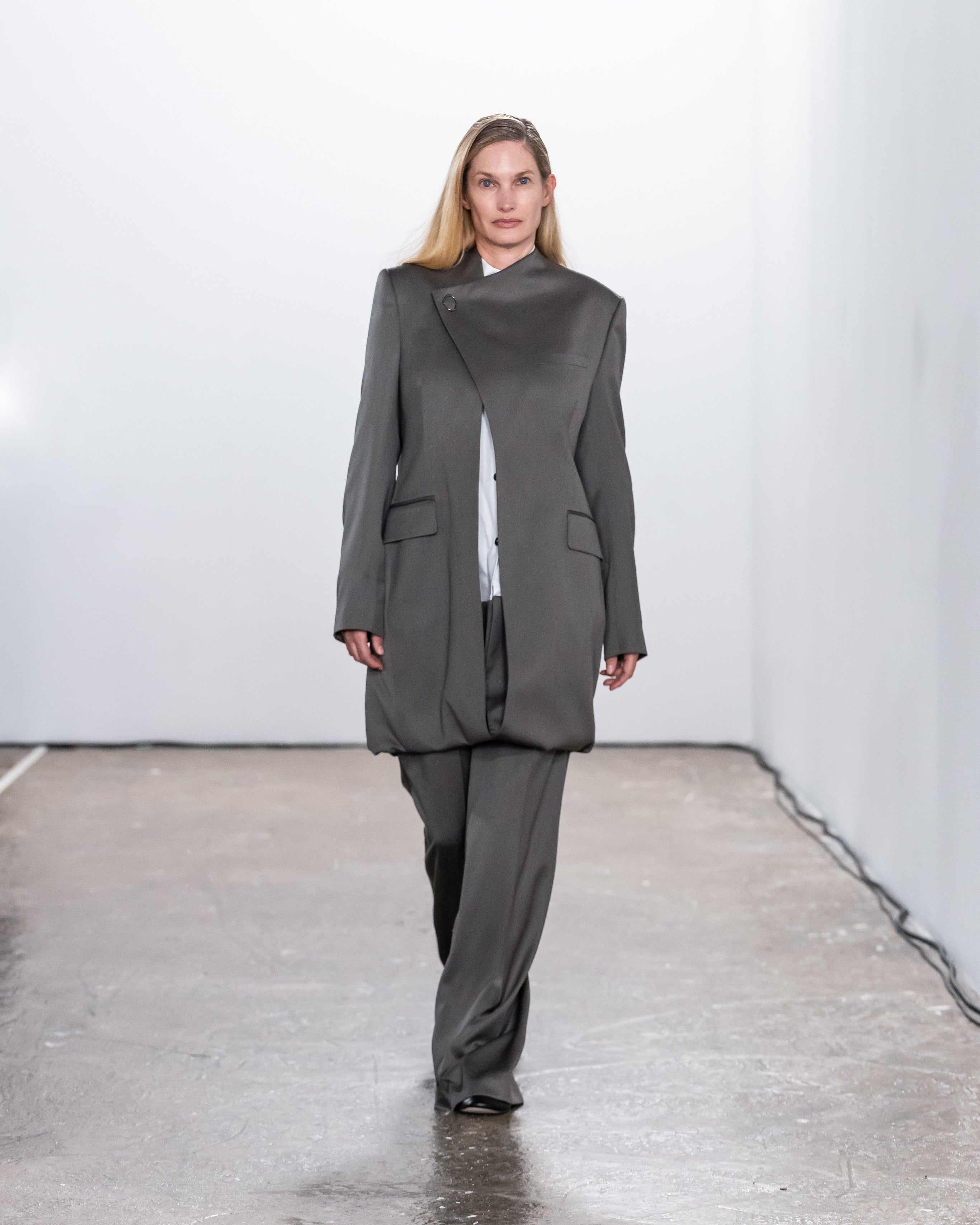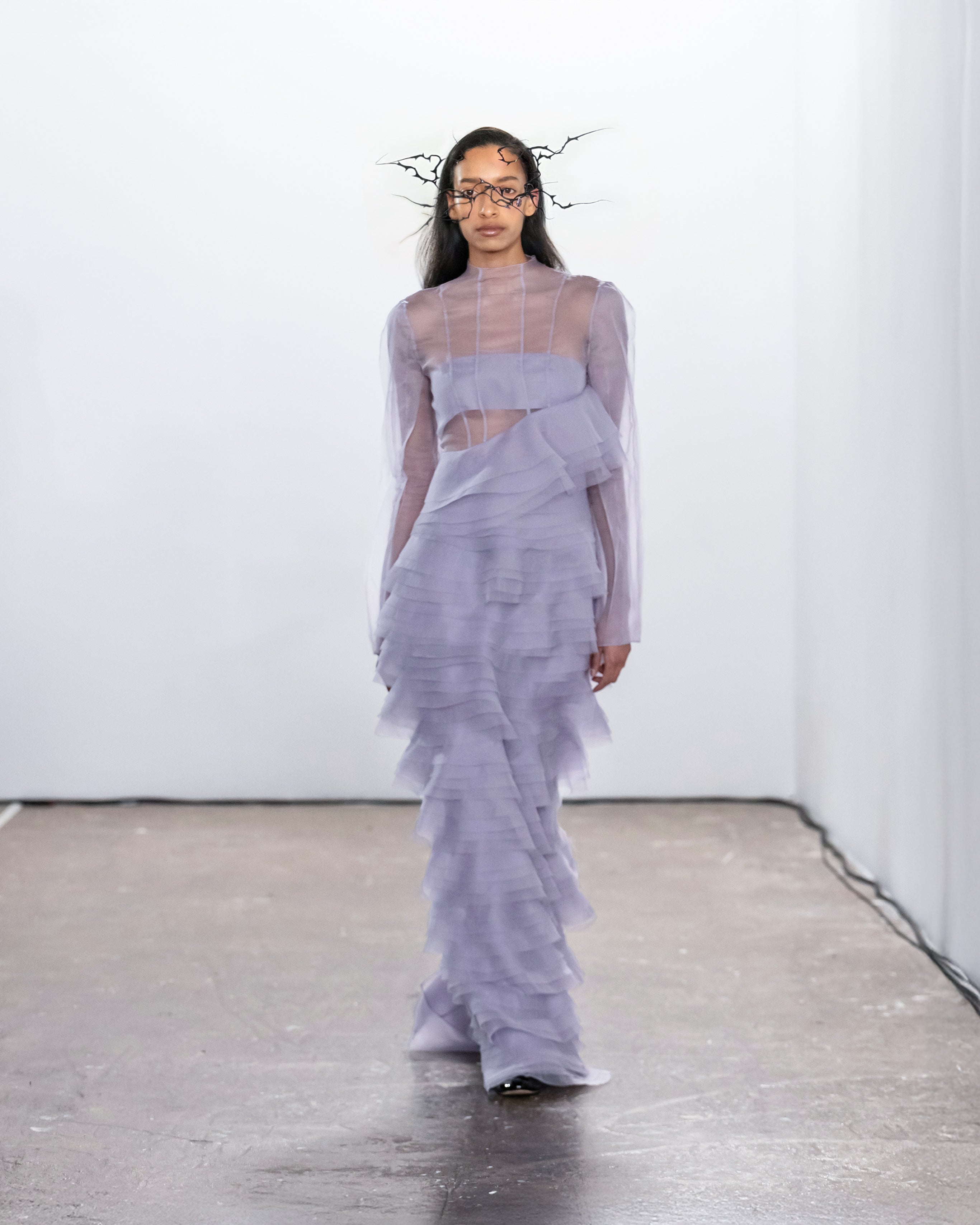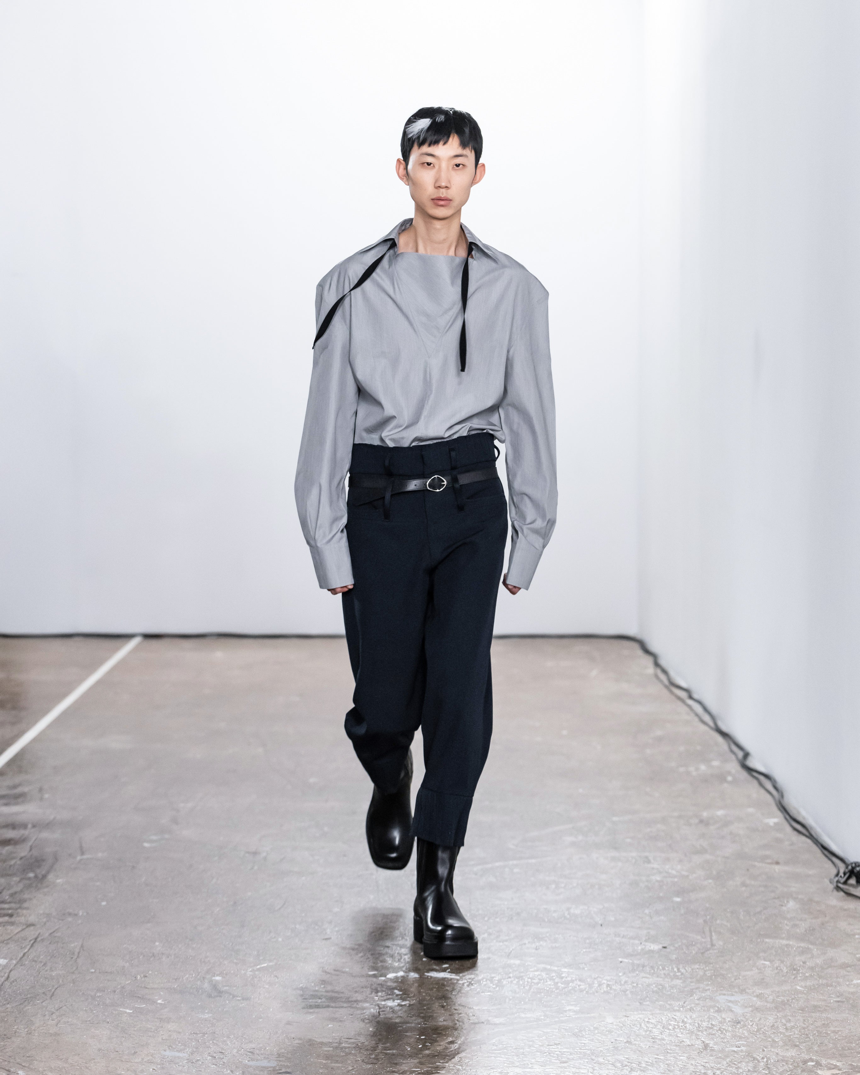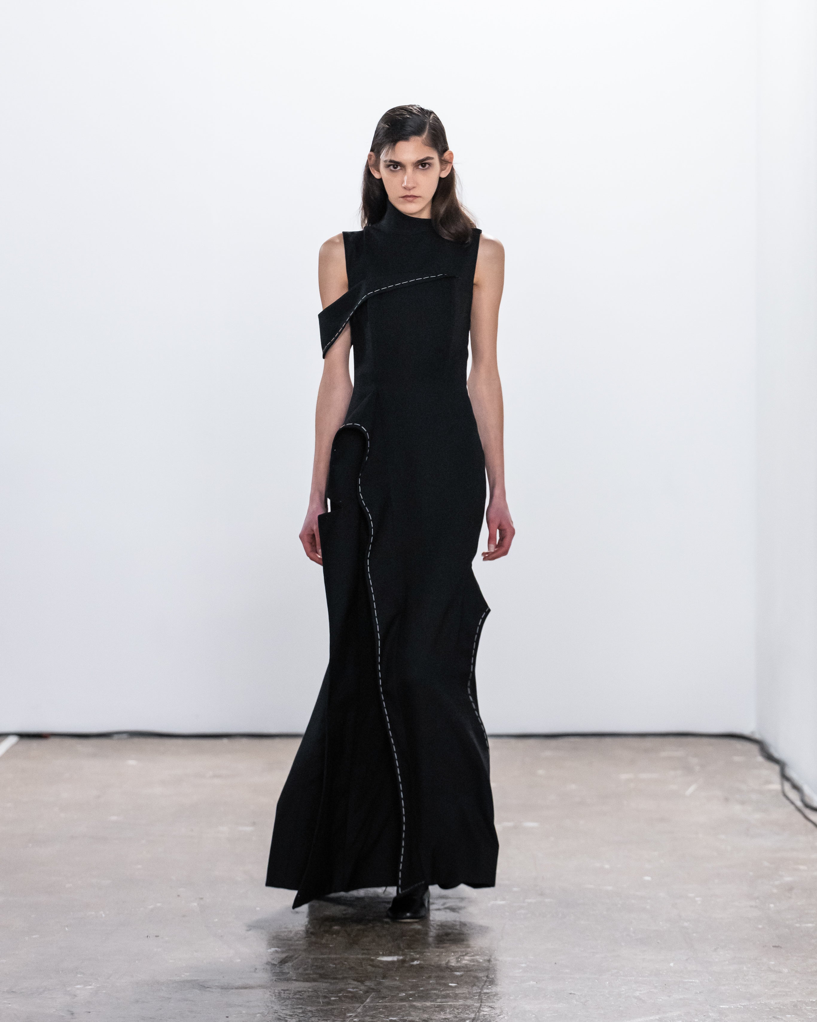 Les créations incarnent ce récit à travers une fusion de lignes nettes et structurées et de formes douces et fluides, représentant nos dualités intérieures. Le drapé romantique rencontre la résistance des coupes, tandis que les textures superposées et les coupes asymétriques symbolisent la complexité de l'identité. Plis complexes, détails cachés et imperfections délibérées soulignent la beauté de l'impermanence et de l'évolution.