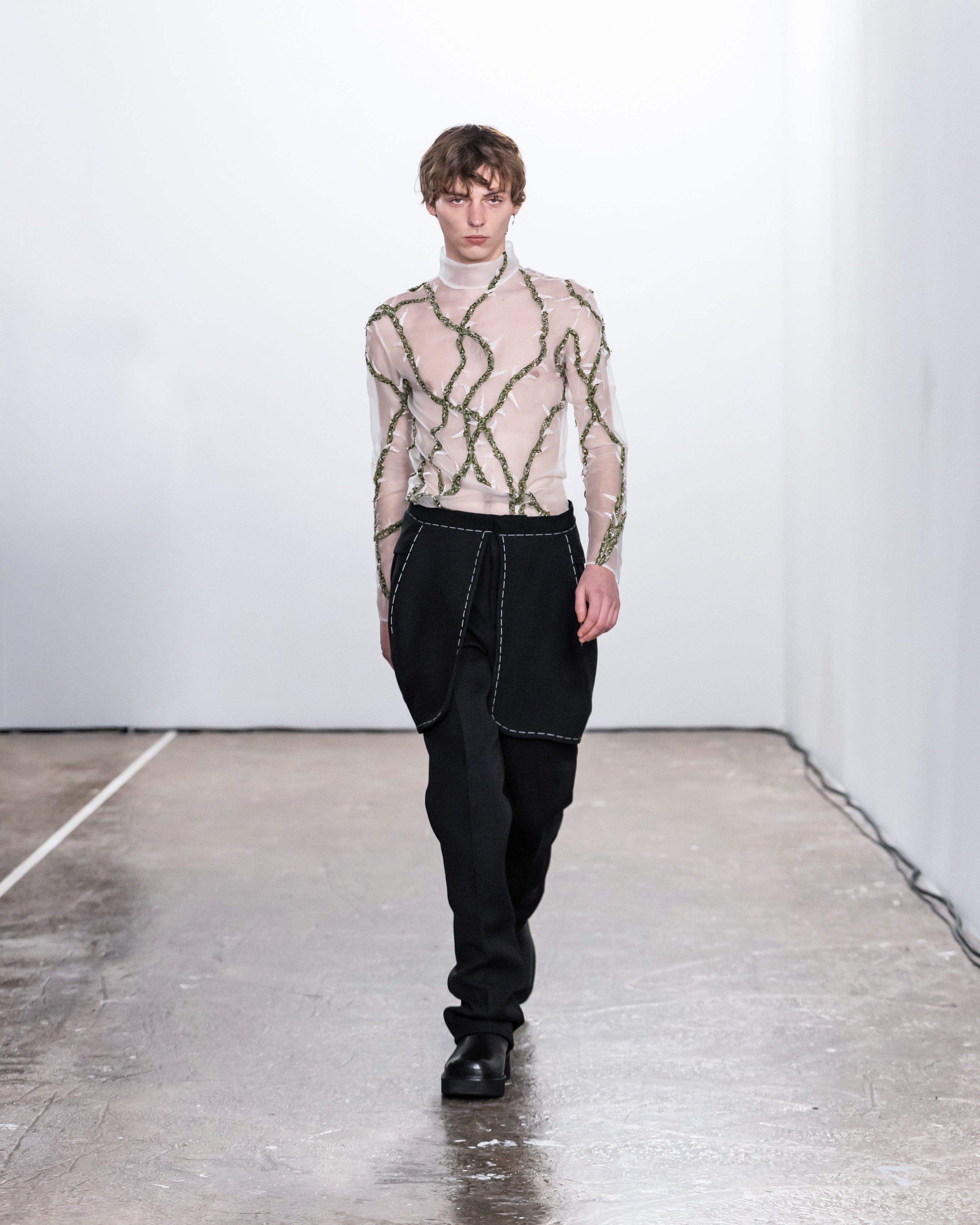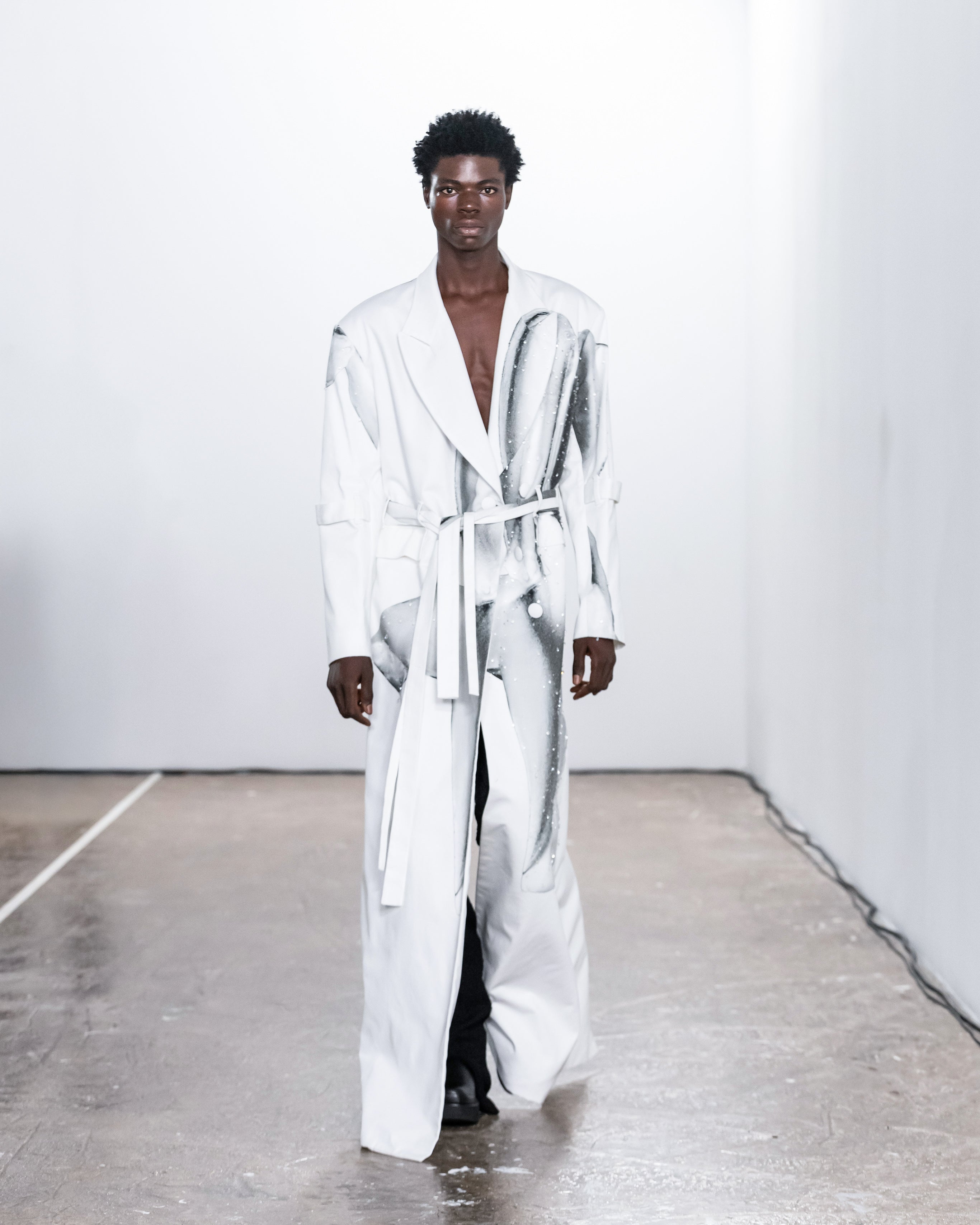 « FRAGMENTED SELF » rend hommage aux moments clés de la transformation. Il honore les espaces intermédiaires, où l'inconfort cède la place à la clarté, et où la fragmentation mène à la réinvention. Chaque vêtement rend hommage à ces transitions, invitant ceux qui le portent à accueillir les fragments de leur parcours comme des parties intégrantes de leur identité.