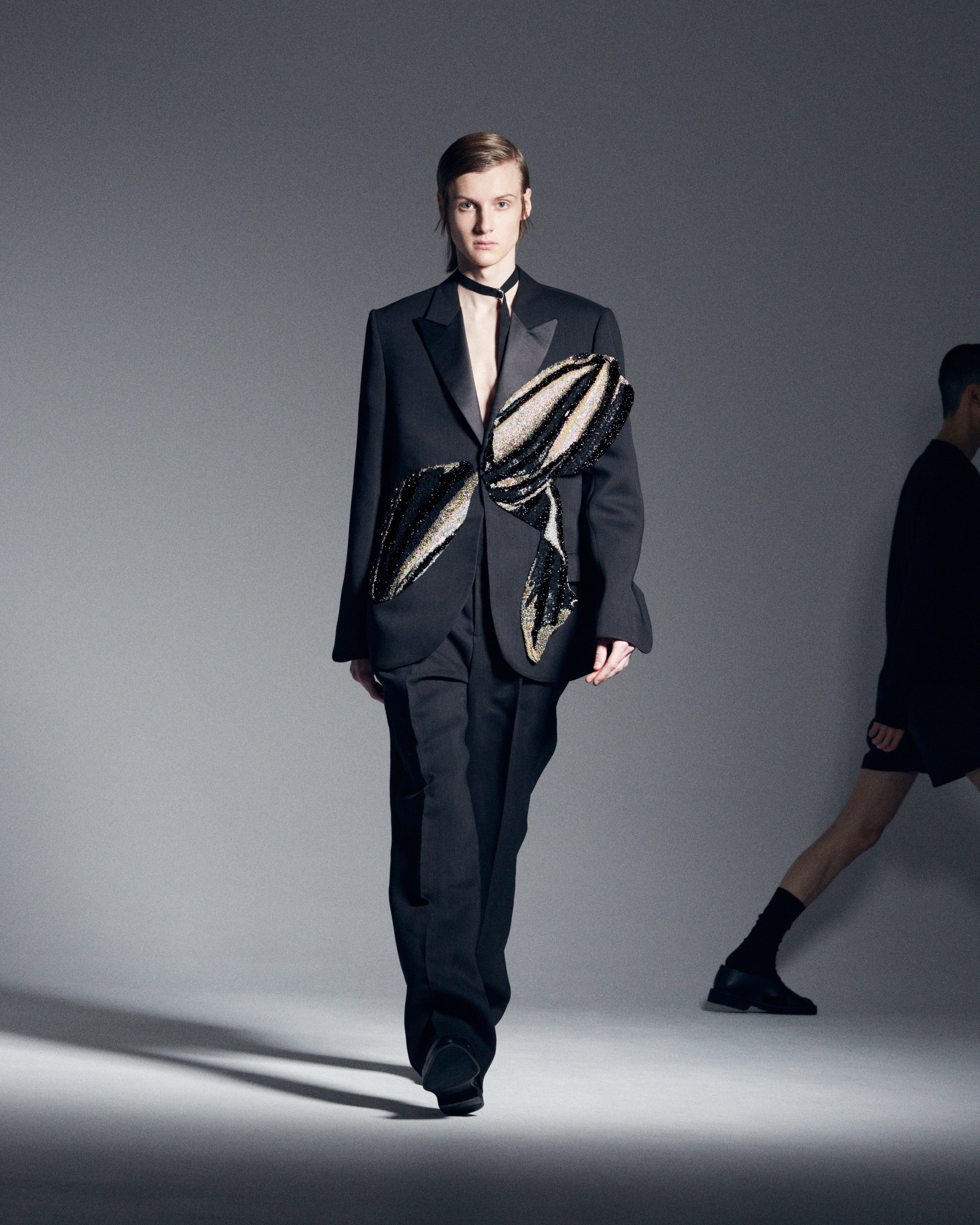 A deconstructed jacket with an open chest with tulle plissé suggests waves crashing onto the shores. As a result of constant research and mentoring, the collection is adorned with haute couture savoir-faire: hand-sewn embroidery, leather embellishment and organza silk layering.