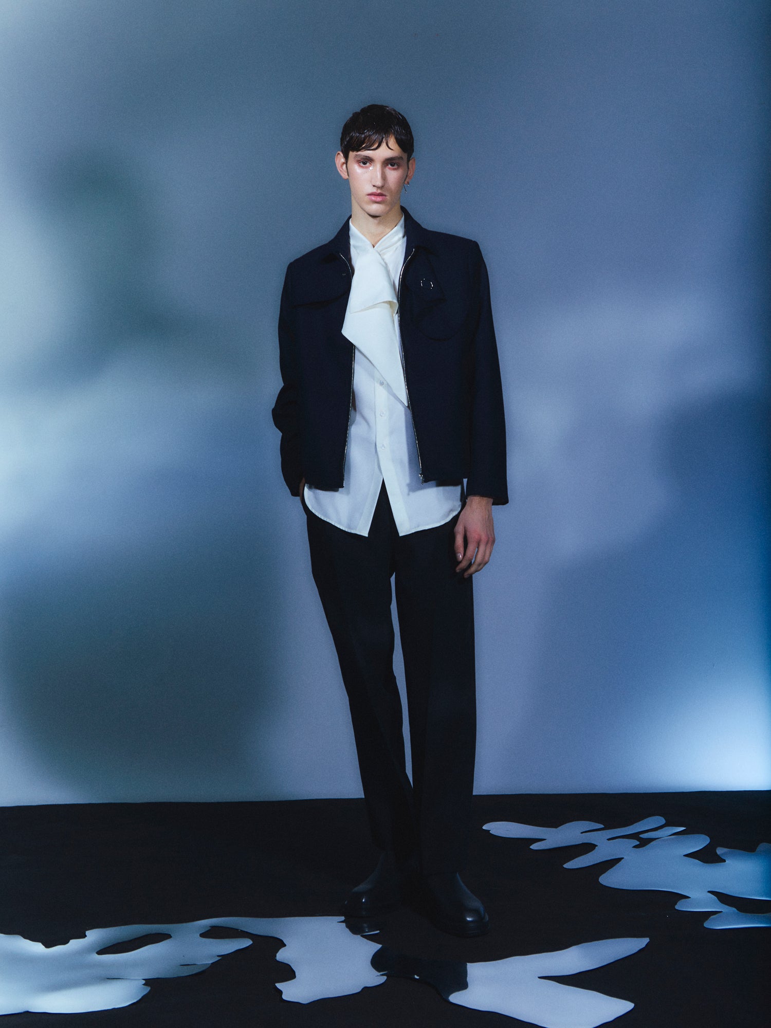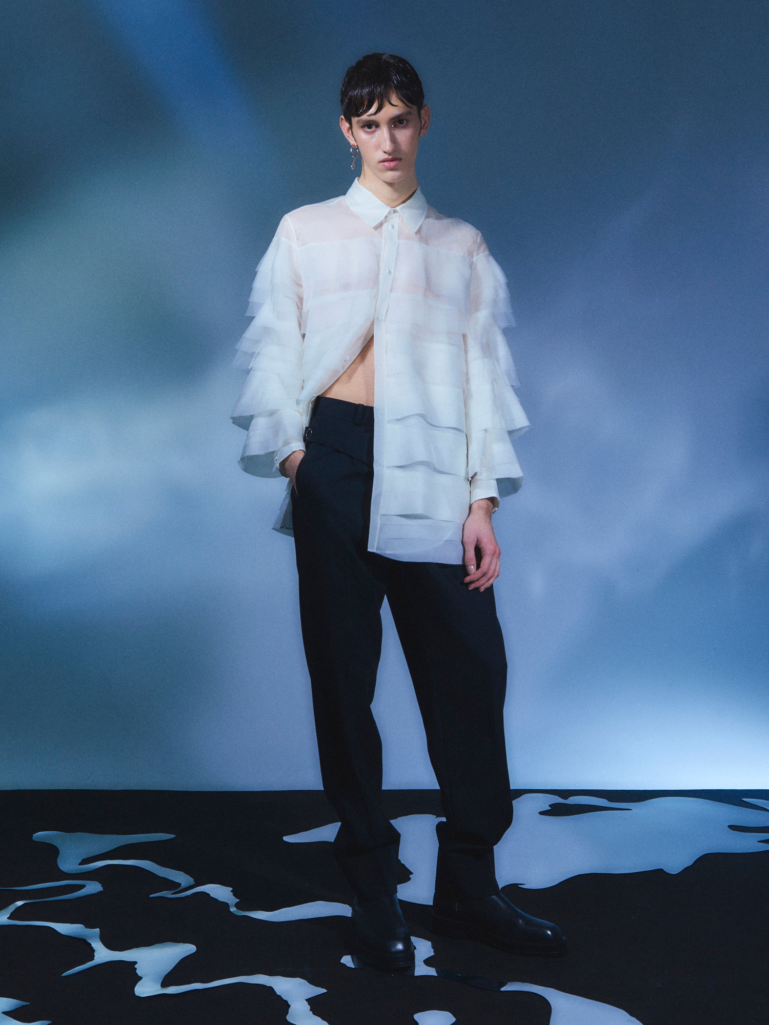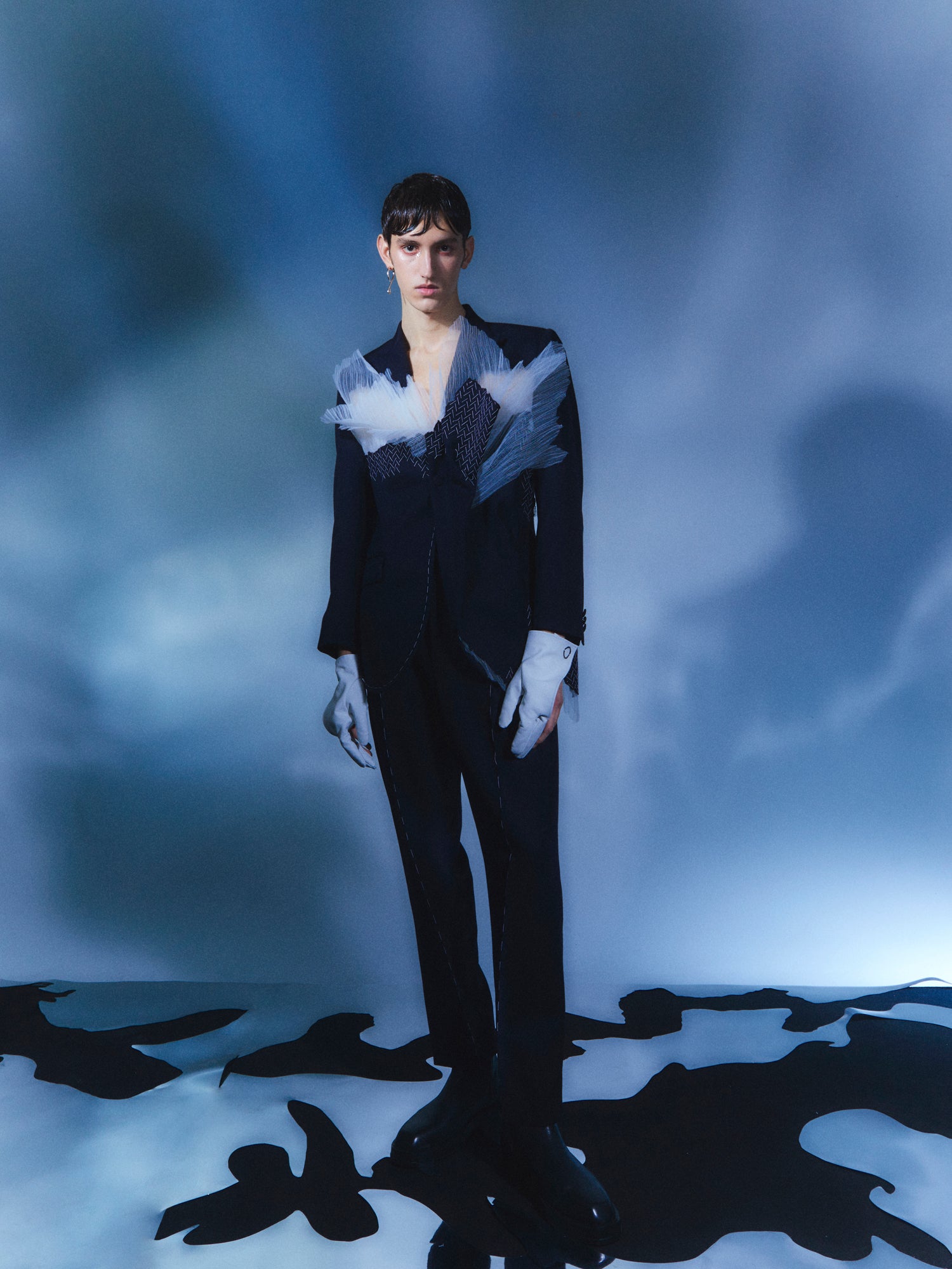 Les œuvres de la photographe allemande Caroline Koenigs se transforment en jacquard tricoté. Une veste déstructurée, ouverte sur la poitrine et ornée d'un tulle plissé, évoque les vagues s'écrasant sur le rivage. Fruit d'une recherche et d'un accompagnement constants, la collection s'inspire du savoir-faire de la haute couture : cousu main.