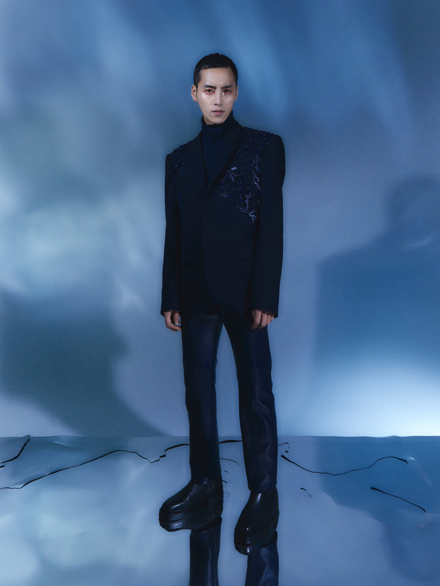 Broderies, ornements en cuir et superpositions de soie organza. Steven Passaro propose une vision épurée du tailleur contemporain, avec des détails délicats pour l'homme moderne.